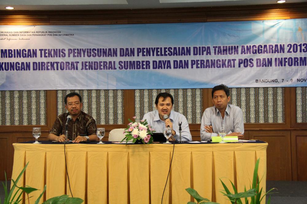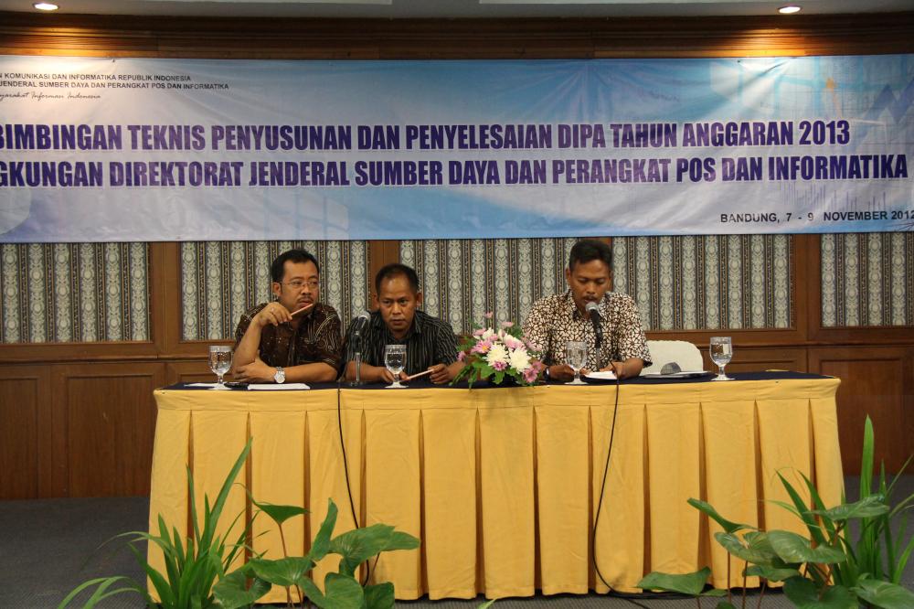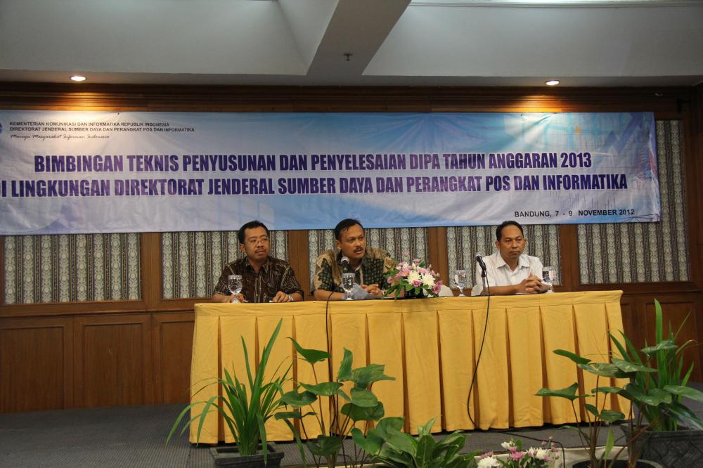 Pada tanggal 7 – 9 November 2012 Direktorat Jenderal Sumber Daya dan Perangkat Pos dan Informatika menyelenggarakan Bimbingan Teknis Penyusunan dan Penyelesaian DIPA T.A. 2013 dilingkungan Ditjen SDPPI di Hotel Jayakarta Bandung. Acara ini dibuka oleh Kepala Bagian Keuangan SDPPI mewakili Sekretaris Direktorat Jenderal SDPPI dengan narasumber Bapak Siswanto dan Bapak Alwi dari Ditjen Perbendaharaan –Kementerian Keuangan serta Bapak Dodi Tri Wibowo dari Ditjen Anggaran –Kementerian Keuangan.