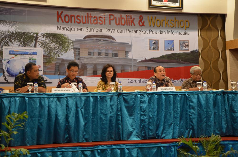 Pada tanggal 17 September 2015 bertempat di Maqna Hotel Gorontalo, Direktorat Operasi Sumber Daya telah melaksanakan Konsultasi Publik dan Workshop Manajemen Sumber Daya dan Perangkat Pos dan Informatika. Pada kesempatan tersebut ketua panitia, Andina Rufiany M Zein, menyampaikan bahwa maksud dilaksanakannya kegiatan ini adalah untuk memberikan informasi diantaranya tentang penggunaan spektrum frekuensi radio dan sertifikasi operator radio serta proses pelayanan perizinan frekuensi radio. Selain itu kegiatan konsultasi publik bertujuan memberikan pemahaman tentang pemanfaatan spektrum frekuensi radio dan sertifikasi operator radio agar dalam penggunaannya tidak menimbulkan gangguan / interferensi yang merugikan.