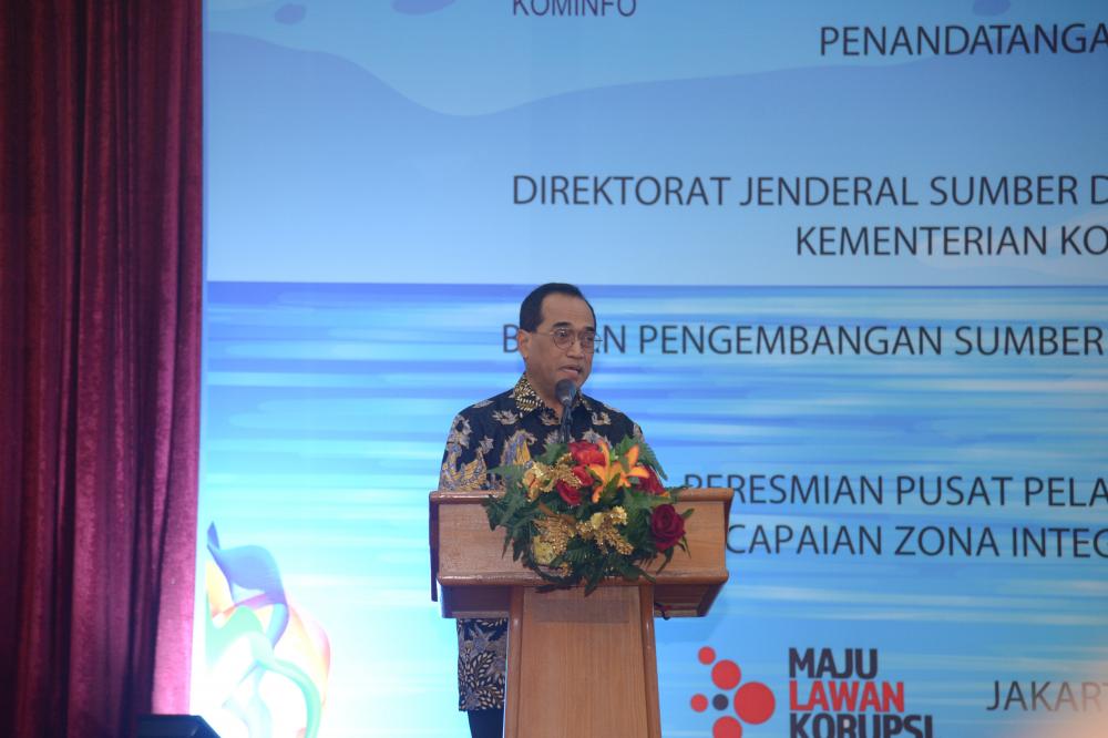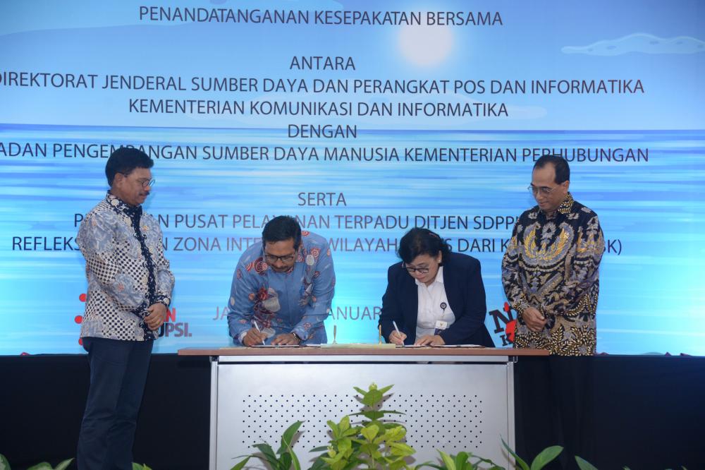 Kesepakatan Bersama ditandatangani Dirjen SDPPI Kemkominfo Ismail dan Kepala BPSDM Kemenhub Umiyatun Hayati Triastuti. Penandatanganan disaksikan Menkominfo Johnny G Plate dan Menhub Budi Karya Sumadi di Auditorium Adhiyana, Wisma Antara, Jakarta Pusat, Senin (13/01/2020).